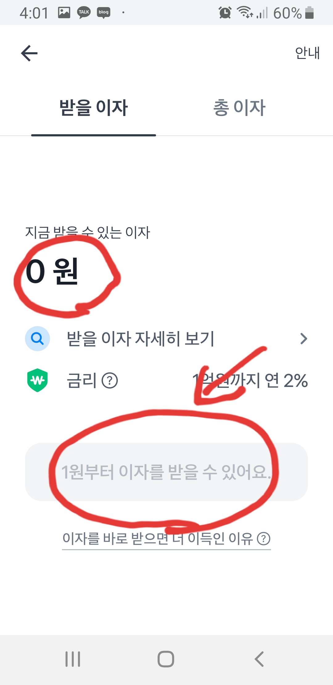 받을 이자를 클릭->그럼 넣어놓은 돈의 이자를 얼마 받을 수 있는지가 나옵니다.